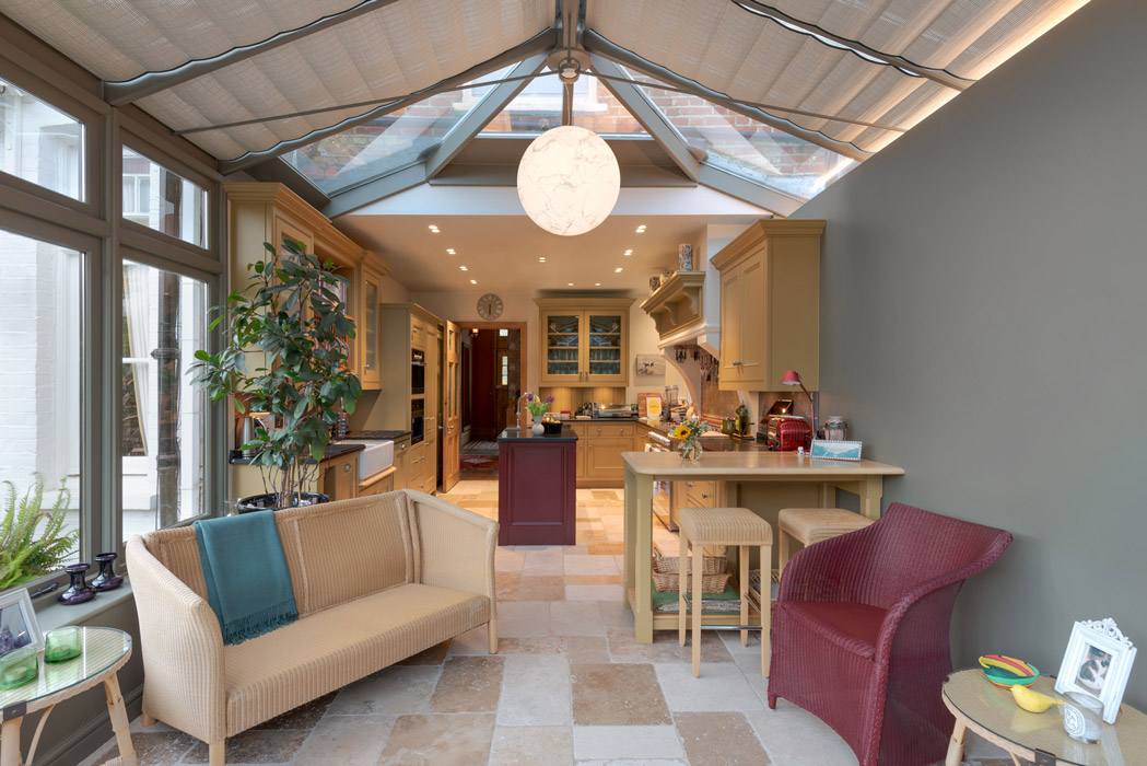 In the kitchen, directional downlights and under-cabinet luminaires provide the required task and accent lighting to make meal preparation a breeze, while two large decorative globe pendants provide soft and diffused illumination in the conservatory and act as strong focal points for both the interior and exterior.
