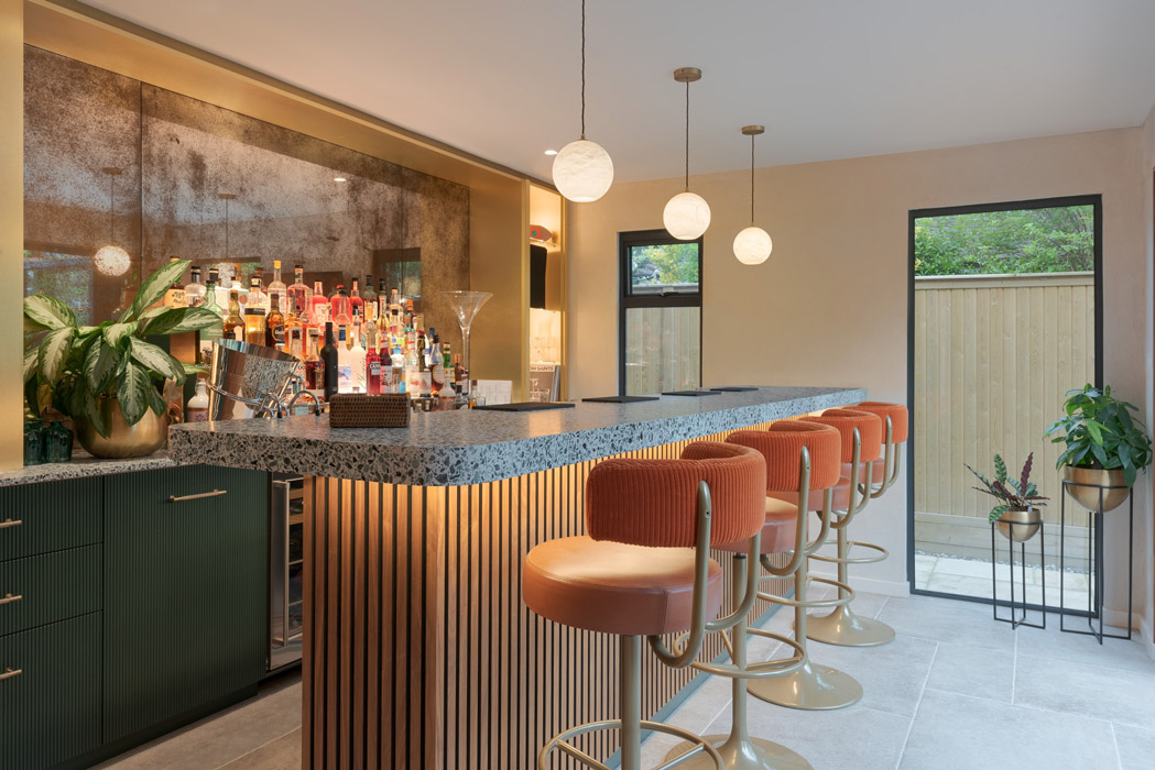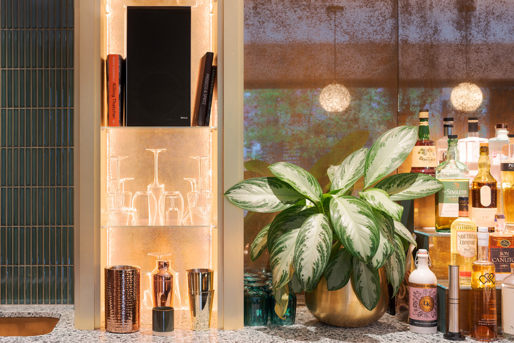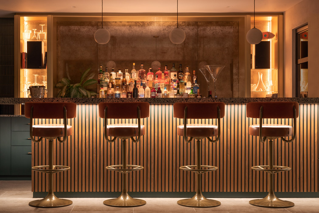 The Garden Room houses a beautiful bar, where the lighting has been carefully integrated in the bespoke joinery to highlight the warm brass, golden and wood finishes and provide dramatic accent lighting to the bottles taking centre stage in front of an antique mirror background, for an overall warm and inviting ambience.